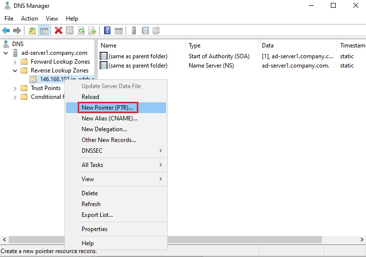 1. Mở DNS Manager, click chuột phải vào tên của Reverse Lookup Zone, và click New Pointer (PTR).