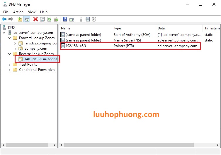 8. DNS PTR Record đã được tạo ra. Và chúng ta xác nhận lại DNS PTR Record trong DNS PTR Record.