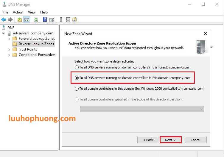 Lưu ý: Trong Hướng dẫn này, DNS tích hợp Active Directory được sử dụng, máy chủ DNS chạy trên domain controllers có thể lưu trữ các zones của chúng trong Dịch vụ Active Directory domain services.