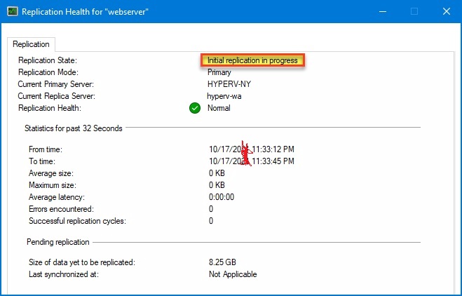 Cửa sổ Replication Health hiển thị trạng thái (Initial Replication, Healthy…), lượng dữ liệu đã gửi, điểm khôi phục hiện tại, v.v. Ban đầu, bạn sẽ thấy trạng thái Replication Health: Initial replication in progress (đang sao chép ban đầu). Đợi đến khi quá trình initial copy hoàn thành, trạng thái sẽ chuyển thành Replication enabled hoặc Healthy, nghĩa là VM đã được bảo vệ. Lúc này, máy ảo trên máy chủ 2 sẽ xuất hiện trong danh sách với trạng thái Off và được gán nhãn (Replica). Xin chúc mừng, bạn đã thiết lập xong Hyper-V Replica cho máy ảo!