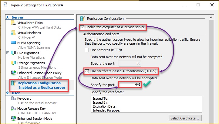 Tường lửa: Mặc định khi cài vai trò Hyper-V, Windows đã tạo các rule tường lửa cho Hyper-V Replica trên các cổng TCP 80 (HTTP) và 443 (HTTPS). Tuy nhiên bạn cần mở (enable) các rule này trước khi replication hoạt động. Đối với môi trường workgroup dùng certificate, hãy mở Hyper-V Replica HTTPS Listener (TCP-In) trên cả hai máy chủ. Còn nếu dùng Kerberos trong domain, mở Hyper-V Replica HTTP Listener (TCP-In). Nếu có firewall mạng ngoài Windows, cần thiết lập tương tự để cho phép luồng dữ liệu replication giữa hai host đi qua.