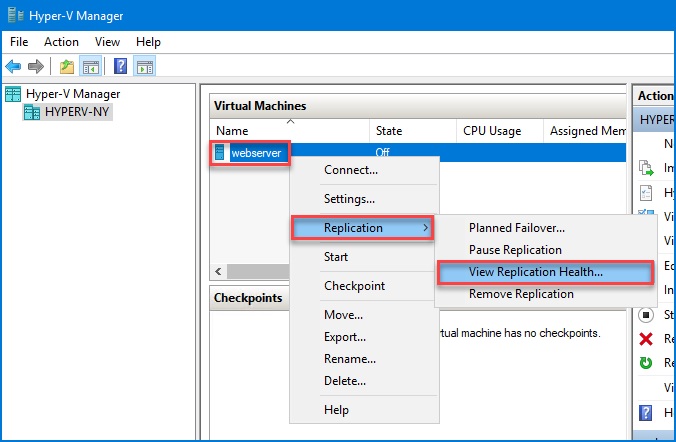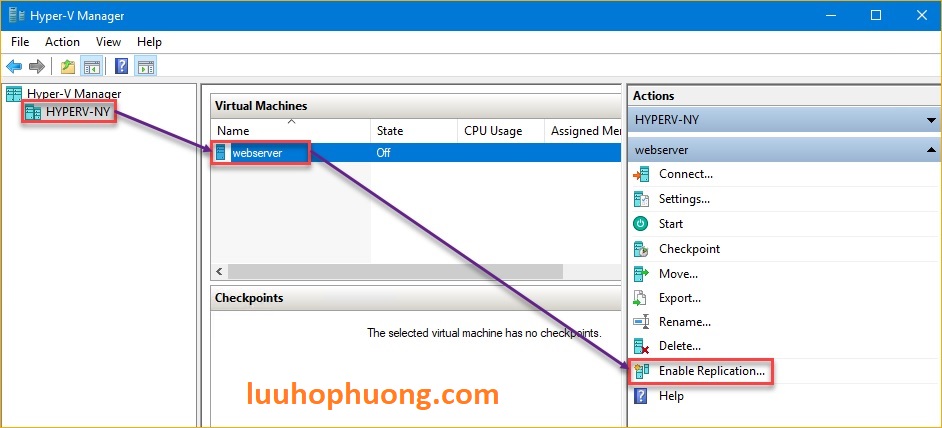 Minh họa: Thao tác bật Hyper-V Replica cho máy ảo trên Hyper-V Manager (máy ảo “webserver” trên host HYPERV-NY).