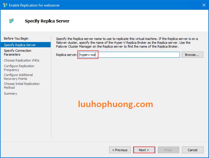 Trang “Specify Replica Server”: nhập tên máy chủ Replica. Ở đây, điền vào tên DNS/NetBIOS của máy chủ 2 (ví dụ: