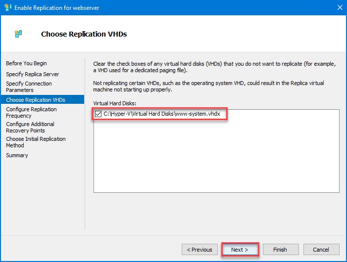 Trang “Choose Replicated VHDs”: chọn các đĩa cứng ảo (VHD/VHDX) của VM cần replicate. Mặc định tất cả các ổ đĩa gắn trên VM sẽ được chọn. Nếu VM có những ổ đĩa không cần thiết cho DR (ví dụ ổ chứa file hoán trang page file hoặc cache tạm), bạn nên bỏ chọn để loại trừ khỏi quá trình replicate nhằm tiết kiệm băng thông và dung lượng. Trong ví dụ này, giả sử máy ảo chỉ có một ổ hệ điều hành nên ta giữ nguyên. Click Next.