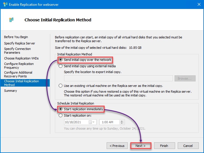 Tùy điều kiện thực tế để chọn cách phù hợp. Ở đây, giả sử hai máy chủ cùng mạng LAN gigabit, ta chọn Sao chép qua mạng. Tiếp theo, chọn Start replication immediately (bắt đầu sao chép ngay lập tức sau khi cấu hình). Click Next.