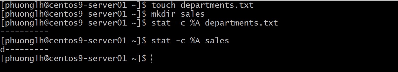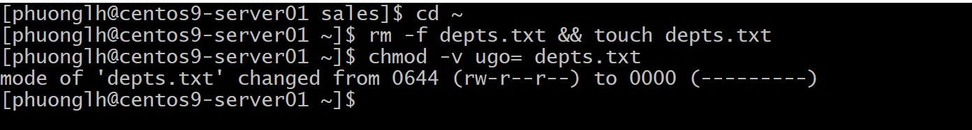 Kết quả cho thấy cả file departments.txt và thư mục sales đều có quyền ---------- (mười ký tự gồm dấu -, trong đó ký tự đầu xác định loại đối tượng: - cho file và d cho thư mục, và chín ký tự sau đều là - nghĩa là không ai có quyền gì). Lý do: đối với thư mục, 777 trừ 777 bằng 000; đối với file, 666 trừ 777 cho kết quả âm nên hệ thống cũng hiểu là 000. Như vậy umask 777 khiến mọi thứ tạo ra không ai có quyền truy cập (trừ root vẫn có thể can thiệp bằng cách đổi quyền sau đó).