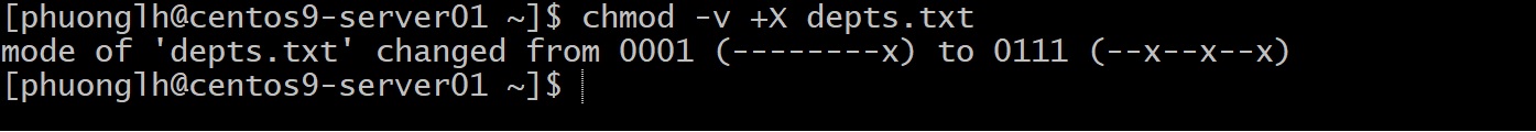 Lần này không có gì thay đổi – depts.txt vẫn không được cấp quyền thực thi. Lý do là vì không có bất kỳ user/group/others nào hiện đang có x, và file depts.txt cũng không phải là thư mục, nên +X không thêm x cho ai cả. Quy tắc +X đòi hỏi “ít nhất một trong các đối tượng đã có x trước đó” mới tiến hành thêm.