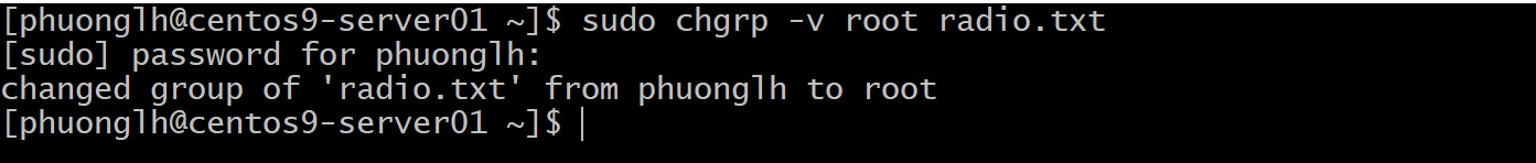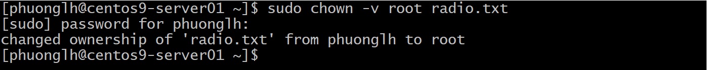 Với quyền sudo, lệnh đã thực hiện thành công: owner của radio.txt đổi từ phuonglh thành root. Nhóm sở hữu vẫn đang là phuonglh (do ta chưa đổi nhóm).