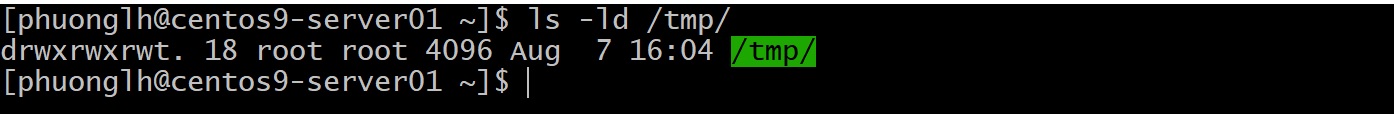 /tmp– nơi mọi user đều có quyền tạo file. Nếu không có sticky, bất kỳ ai cũng có thể xóa file của người khác trong /tmp (do /tmp cho phép ghi tất cả). Nhờ sticky, dù /tmp mở quyền ghi, user chỉ xóa được file của chính mình. Sticky bit được hiển thị bằng ký tựtở vị trí others execute trên thư mục. Ví dụ: