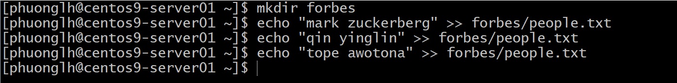 Chúng ta tạo thư mục forbes và một file people.txt trong đó, rồi ghi vào file này một vài cái tên. Hiện tại, do umask mặc định, thư mục forbes có thể đang là 775 và file people.txt là 664 (owner: phuonglh có rw, group có rw với file, etc.). Kiểm tra nhanh: