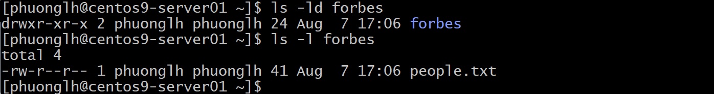 Thư mục forbes hiện cho owner và group rwx, others r-x. File people.txt cho owner và group rw, others r. Điều đó có nghĩa: người khác có thể vào thư mục (x) và liệt kê (r) nên có thể thấy file people.txt, và thậm chí đọc được nội dung file (vì file cho phép others đọc). Bây giờ ta muốn khóa thư mục lại, chỉ chừa quyền x cho mọi người.