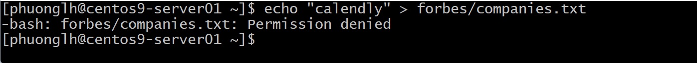 Đúng như dự đoán, lệnh cat để đọc file vẫn hoạt động (phuonglh có quyền đọc), nhưng khi cố ghi “Bravo” vào file thì bị từ chối (phuonglh không có quyền ghi, vì với file này phuonglh chỉ là others).