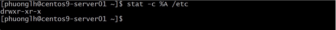 Kết quả cho thấy thư mục /etc có chuỗi quyền rwxr-xr-x tương ứng với giá trị octal 755. Ở dạng octal: